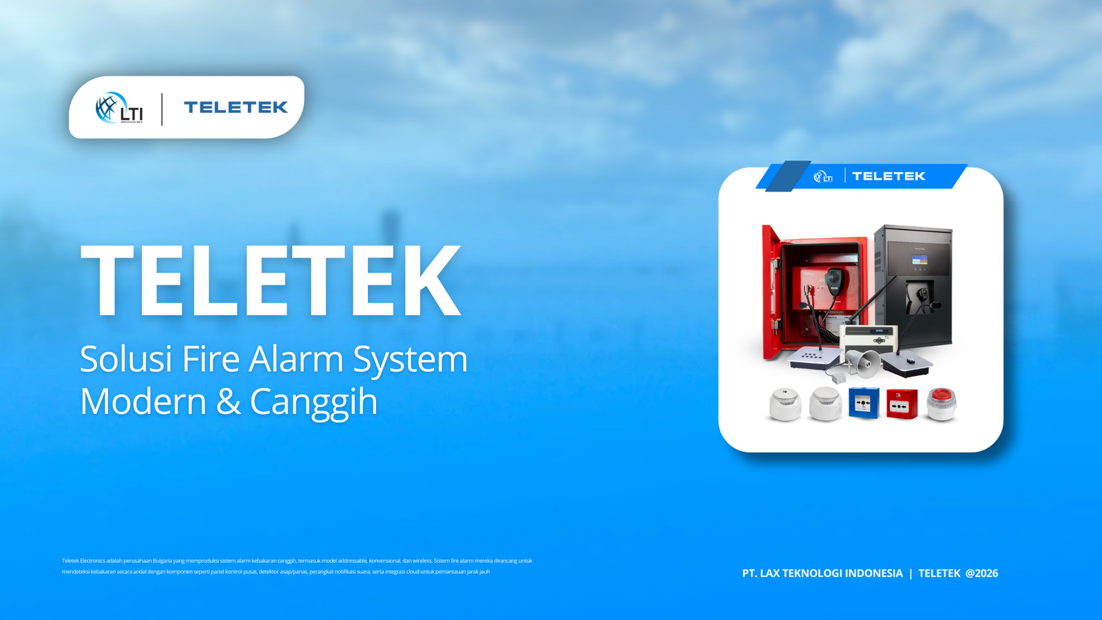 Kebutuhan akan sistem keamanan kebakaran yang andal semakin meningkat, terutama untuk bangunan modern seperti perkantoran, rumah tinggal, hingga fasilitas industri. Salah satu solusi terbaik yang LTI sediakan yaitu Teletek, sistem deteksi kebakaran canggih yang dirancang untuk memberikan perlindungan maksimal dengan respon cepat dan akurat.