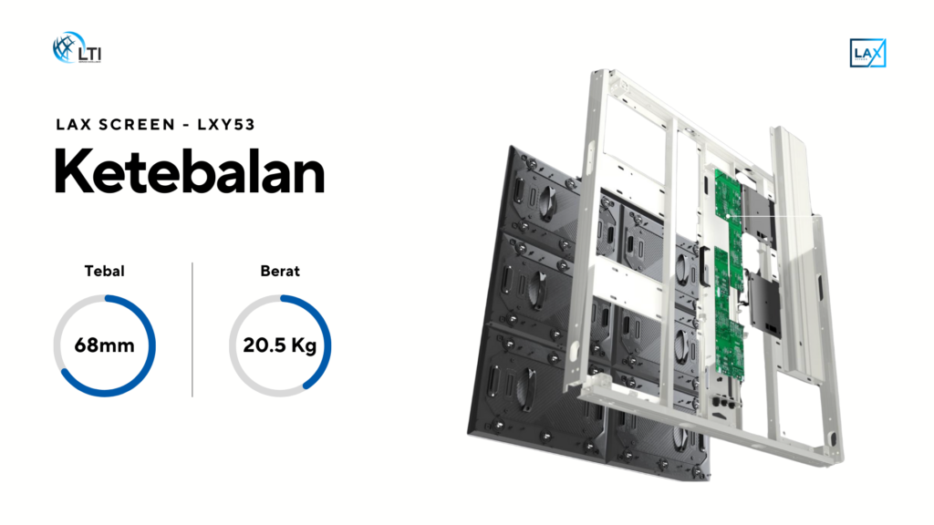 LAX SCREEN LXY53 adalah videotron outdoor canggih yang khusus dibuat untuk media luar ruang. Selain itu, dengan ketebalan hanya 68 mm dan bobot 20,5 kg per cabinet, produk ini mudah dipasang dan tetap terlihat premium.